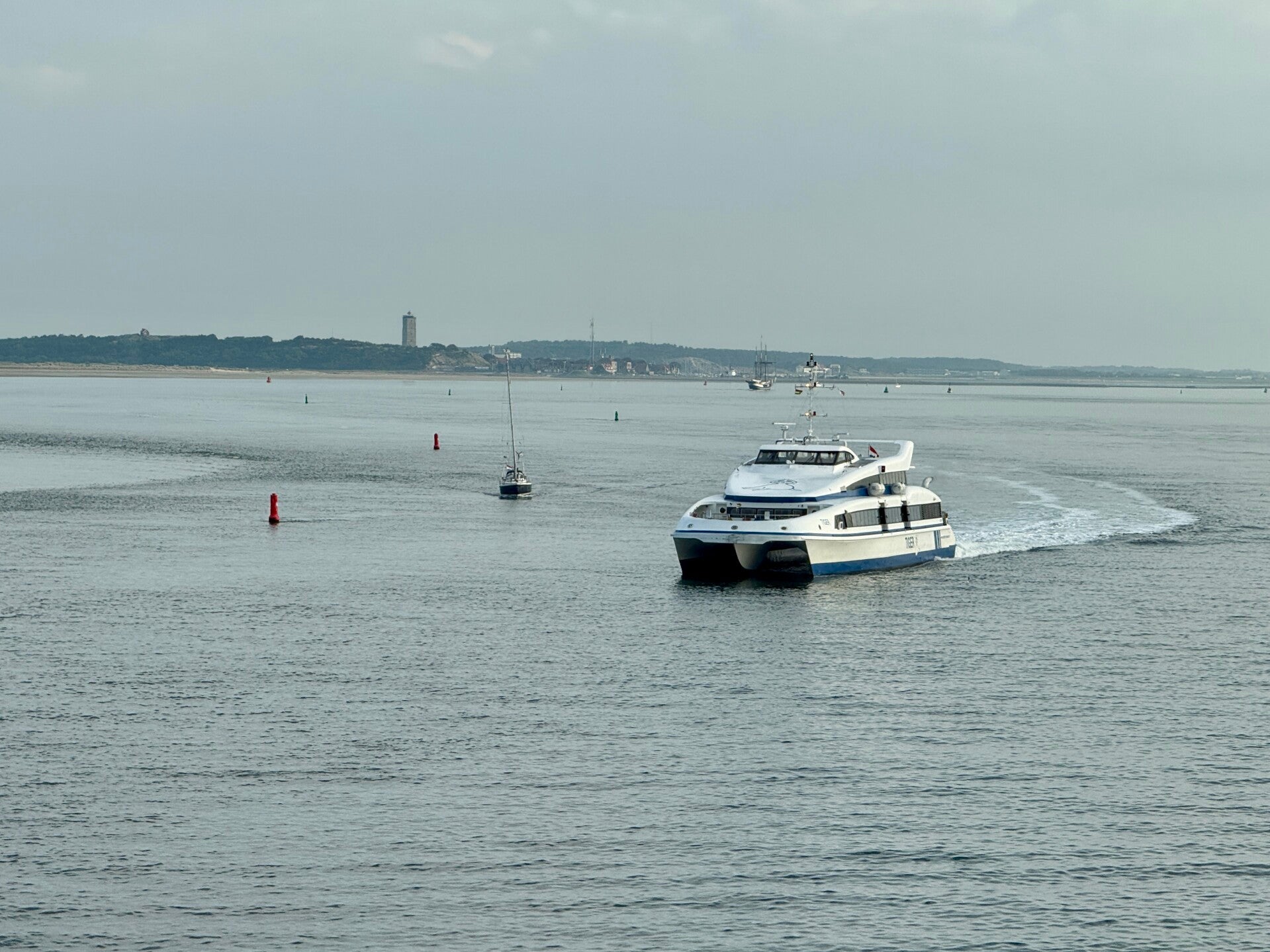 Snelboot TIGER is onderweg voor de 09:25 uur afvaart vanaf Terschelling naar Harlingen, gespot nabij de Pollendam
