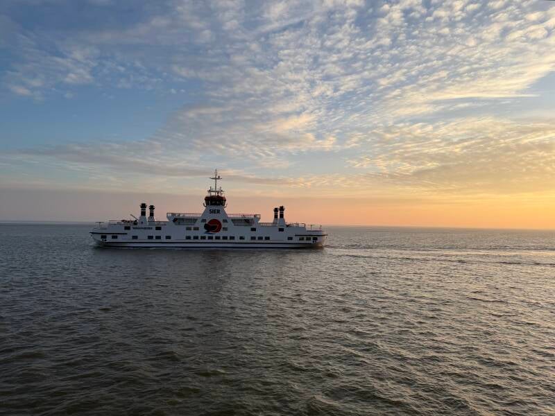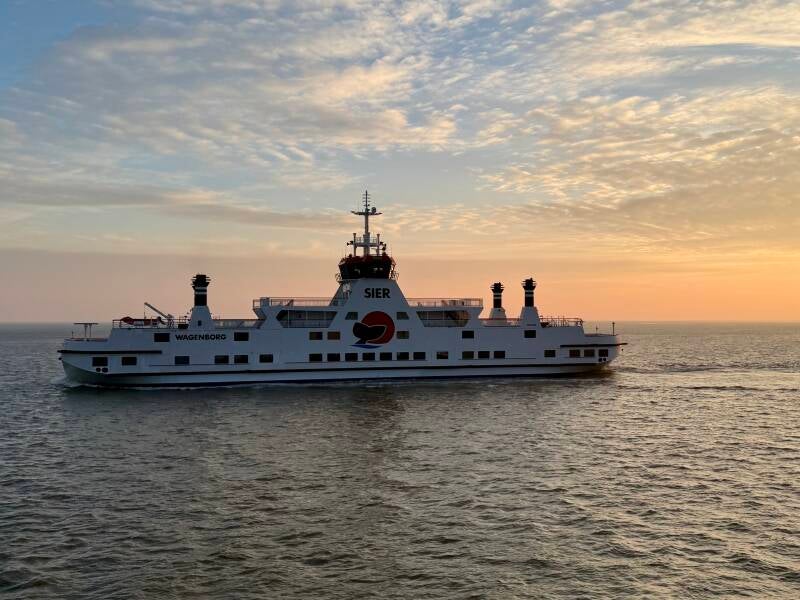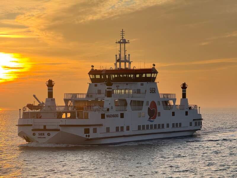 De Amelander veerboot SIER is onderweg vanuit Harlingen naar Ameland, na haar jaarlijkse onderhoud op de werf.